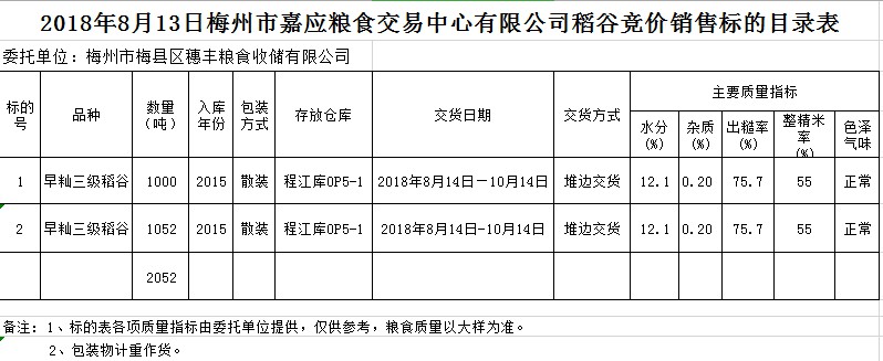 受客戶委托,梅州市嘉應糧食交易中心有限公司定于2018年8月13日(星期一)舉辦糧食競價交易會,梅州市梅縣區(qū)穗豐糧食收儲有限公司擬銷售2015年早秈稻2052噸。