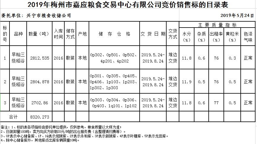 交易時間和地點:2019年5月24日(星期五)上午10時。廣東省梅州市彬芳大道南161號梅州市糧食交易中心3樓。