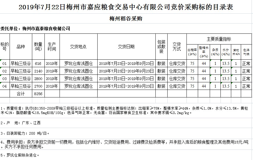 交易時間和地點:2019年7月22日(星期一)上午10時15分。廣東省梅州市彬芳大道南161號梅州市糧食交易中心3樓。
