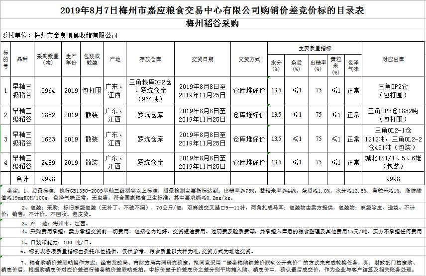 交易時間和地點(diǎn):20198月7日(星期三)上午10。廣東省梅州市彬芳大道南161號梅州市糧食交易中心3樓。