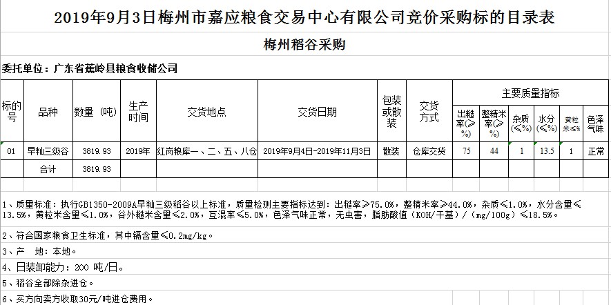 受客戶委托,梅州市嘉應糧食交易中心有限公司定于2019年9月3日(星期二)舉辦糧食競價交易會,廣東省蕉嶺縣糧食收儲公司擬采購2019年早秈稻3819.93噸。
