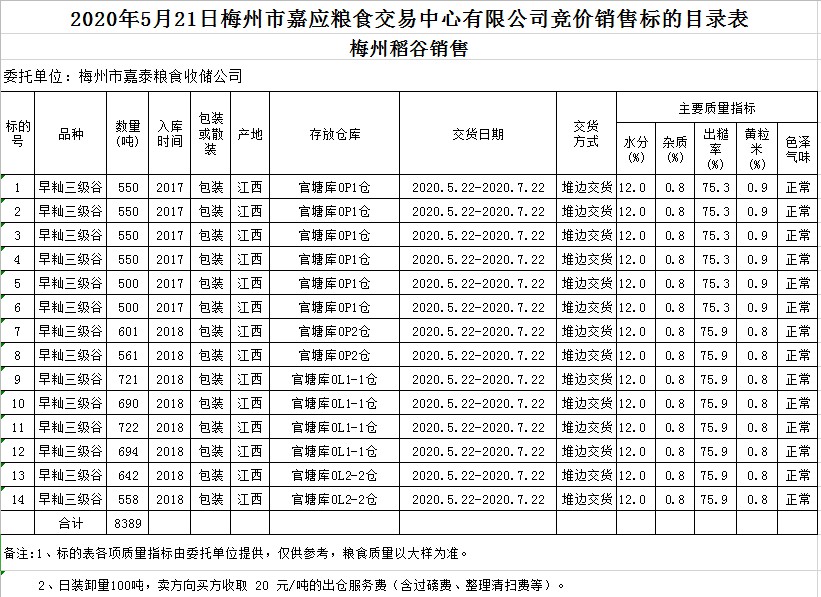 受客戶委托,梅州市嘉應(yīng)糧食交易中心有限公司定于2020年5月21日(星期四)舉辦糧食競價(jià)交易會(huì),梅州市嘉泰糧食收儲(chǔ)公司擬銷售2017年、2018年早秈稻8389噸。
