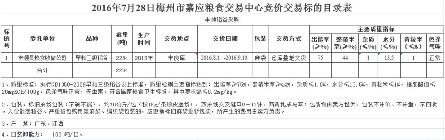 受客戶委托,梅州市嘉應(yīng)糧食交易中心有限公司定于2016年7月28日舉辦糧食競(jìng)價(jià)交易會(huì),豐順縣糧食收儲(chǔ)公司擬采購2016年產(chǎn)早秈三級(jí)稻谷2284噸。
