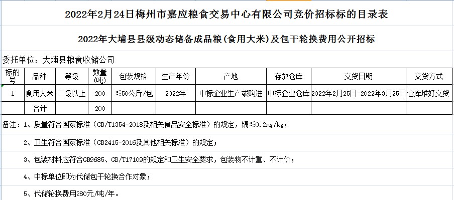 2022年2月24日大埔縣縣級(jí)動(dòng)態(tài)儲(chǔ)備成品糧(食用大米)及包干輪換費(fèi)用公開(kāi)招標(biāo)公告(200噸)