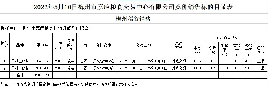 受客戶委托,梅州市嘉應(yīng)糧食交易中心有限公司定于2022年5月10日(星期二)舉辦糧食競價交易會。梅州市嘉泰糧食和物資儲備有限公司擬銷售2019年早秈稻13078.78噸。