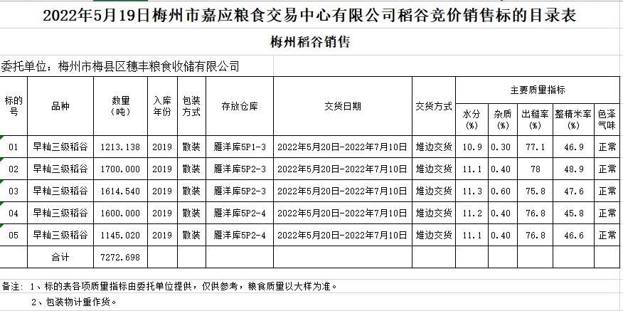 2022年5月19日梅州市梅縣區(qū)穗豐糧食收儲(chǔ)有限公司稻谷銷售