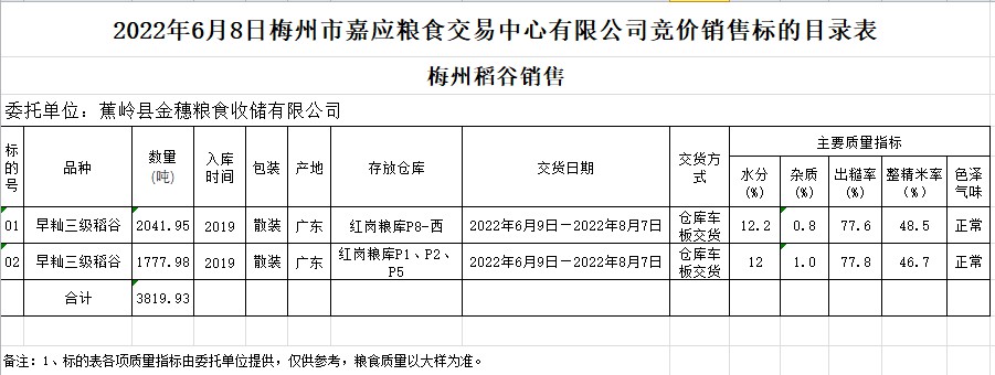 2022年6月8日蕉嶺縣金穗糧食收儲(chǔ)有限公司稻谷銷售