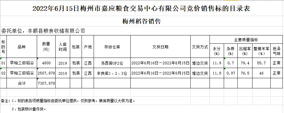 2022年6月15日豐順縣糧食收儲(chǔ)有限公司稻谷銷售