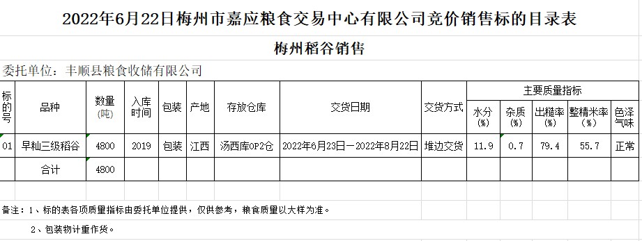 2022年6月22日豐順縣糧食收儲有限公司稻谷銷售