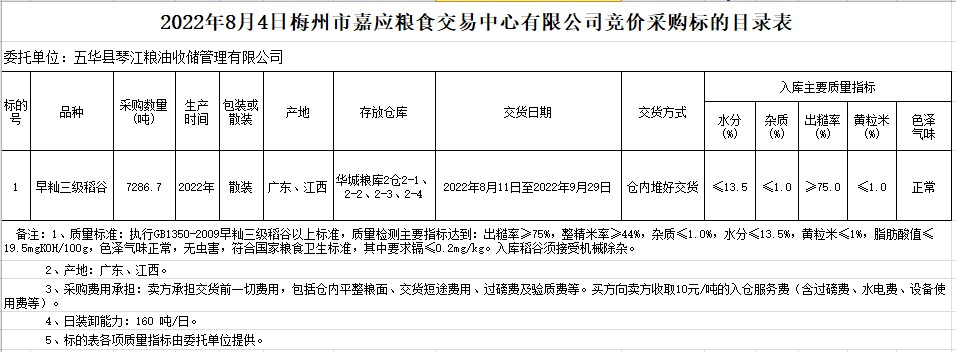 受客戶委托,梅州市嘉應(yīng)糧食交易中心有限公司定于2022年8月4日(星期四)舉辦糧食競(jìng)價(jià)交易會(huì)。五華縣琴江糧油收儲(chǔ)管理有限公司擬采購(gòu)2022年早秈稻7286.7噸。