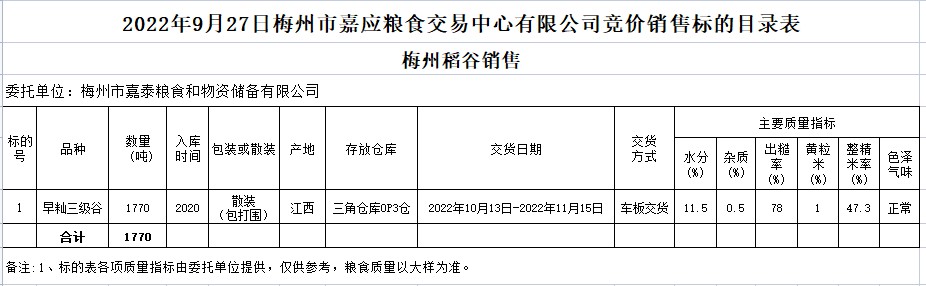 受客戶委托,梅州市嘉應(yīng)糧食交易中心有限公司定于2022年9月27日(星期二)舉辦糧食競價(jià)交易會(huì)。梅州市嘉泰糧食和物資儲(chǔ)備有限公司擬銷售2020年早秈稻1770噸。