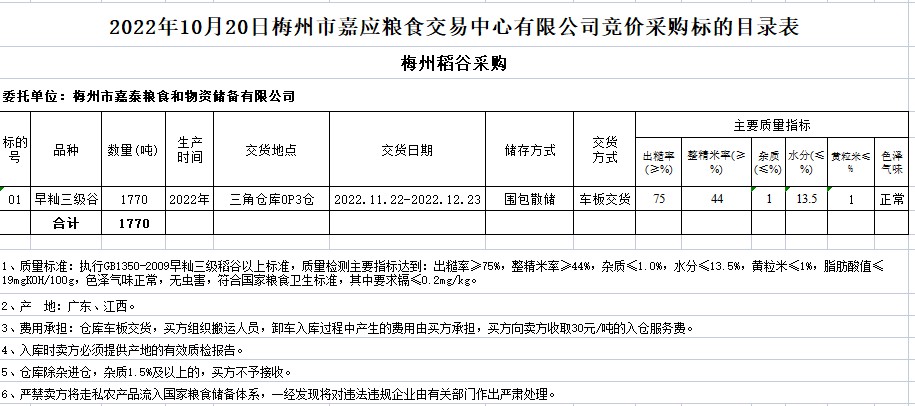 2022年10月20日梅州市嘉泰糧食和物資儲備有限公司稻谷采購