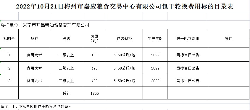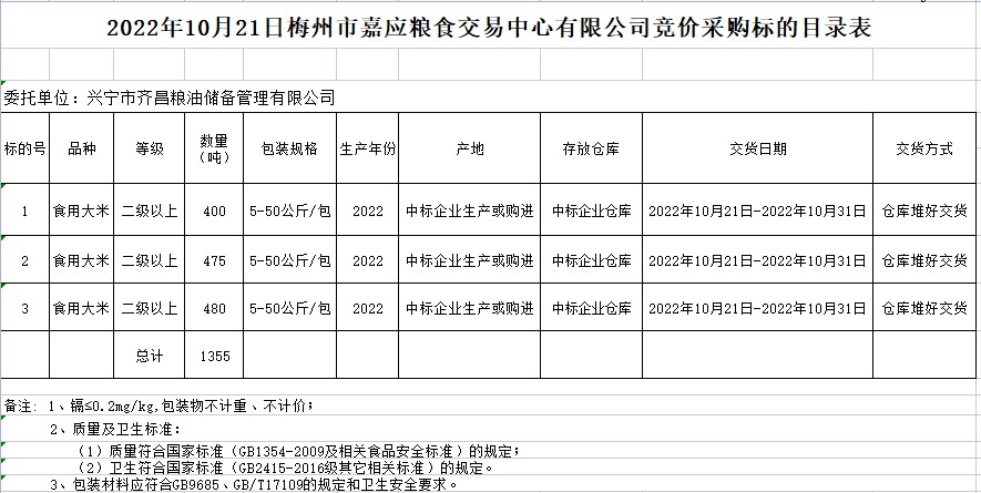 受客戶委托,梅州市嘉應(yīng)糧食交易中心有限公司定于2022年10月21日(星期五)上午10時(shí)在廣東省梅州市彬芳大道南161號(hào)梅州市糧食交易中心3樓,舉辦興寧市本級(jí)成品糧油動(dòng)態(tài)儲(chǔ)備競(jìng)價(jià)采購(gòu)及包干輪換費(fèi)用公開(kāi)招標(biāo)。
