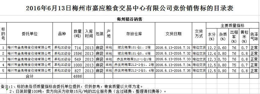 受客戶委托,梅州市嘉應糧食交易中心有限公司定于2016年6月13日舉辦糧食競價交易會,梅州市金良糧食收儲有限公司擬銷售2013年早秈稻谷4686噸。