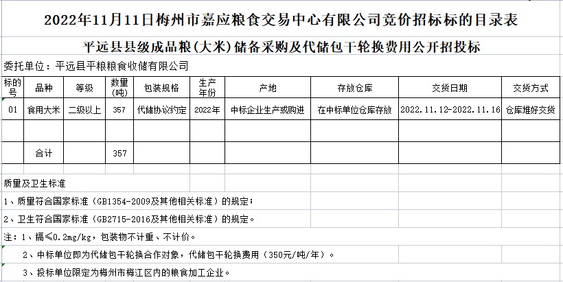 文件下載:2022年11月11日平遠(yuǎn)縣2022年縣級(jí)成品糧采購(gòu)及動(dòng)態(tài)儲(chǔ)備包干輪換公開(kāi)招投標(biāo)公告