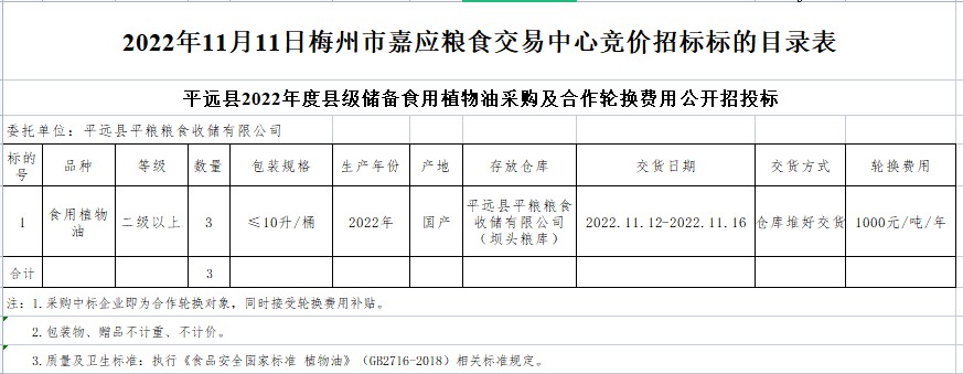 文件下載:2022年11月11日平遠(yuǎn)縣平糧糧食收儲(chǔ)有限公司食用植物油采購及合作輪換費(fèi)公開競(jìng)價(jià)招標(biāo)公告