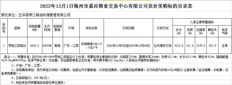 2022年12月1日五華縣琴江糧油收儲管理有限公司稻谷采購