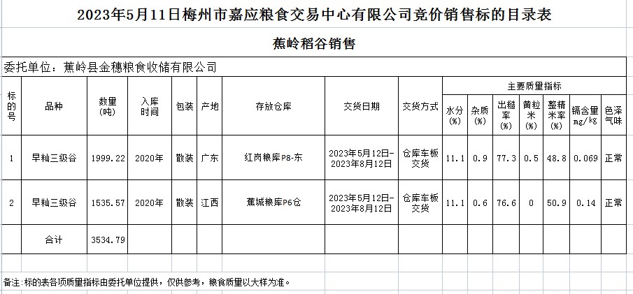 2023年5月11日蕉嶺縣金穗糧食收儲有限公司稻谷銷售