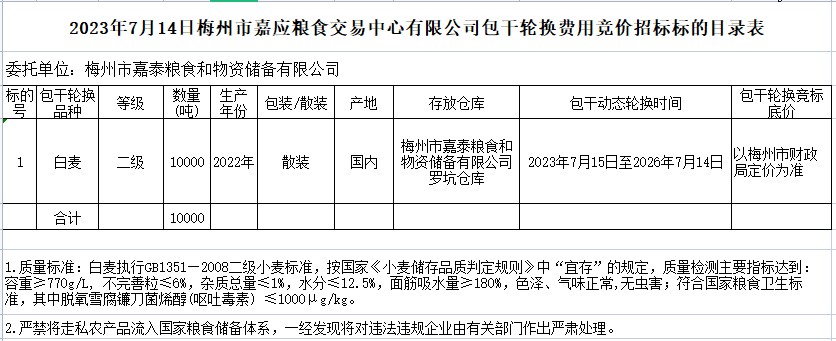 二級(jí)小麥10000噸,總價(jià)款32577858.44元。包干輪換期限為3年,即從2023年7月15日至2026年7月14日。