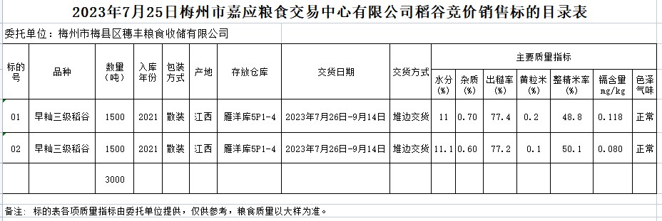 受客戶委托,梅州市嘉應(yīng)糧食交易中心有限公司定于2023年7月25日(星期二)舉辦糧食競(jìng)價(jià)交易會(huì)。梅州市梅縣區(qū)穗豐糧食收儲(chǔ)有限公司擬銷售2021年早秈稻3000噸。