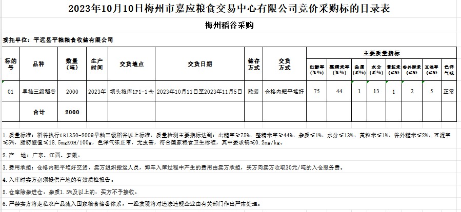 受客戶委托,梅州市嘉應(yīng)糧食交易中心有限公司定于2023年10月10日(星期二)舉辦糧食競(jìng)價(jià)交易會(huì)。平遠(yuǎn)縣平糧糧食收儲(chǔ)有限公司擬采購(gòu)2023年產(chǎn)早秈稻2000噸。