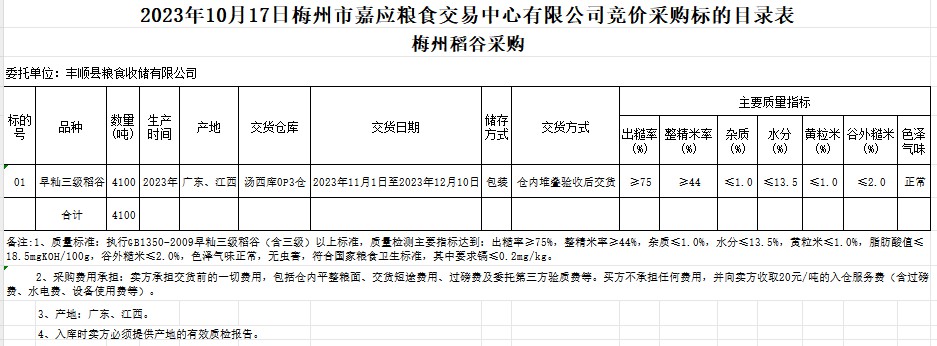 受客戶委托,梅州市嘉應糧食交易中心有限公司定于2023年10月17日(星期二)舉辦糧食競價交易會。豐順縣糧食收儲有限公司擬采購2023年早秈稻谷4100噸。