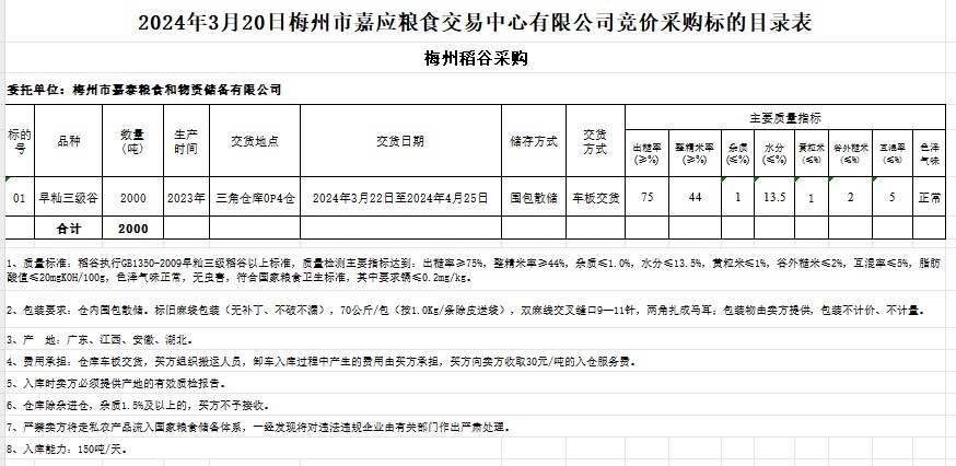 受客戶委托,梅州市嘉應(yīng)糧食交易中心有限公司定于2024年3月20日(星期三)舉辦糧食競價(jià)交易會。梅州市嘉泰糧食和物資儲備有限公司擬采購2023年早秈稻2000噸。