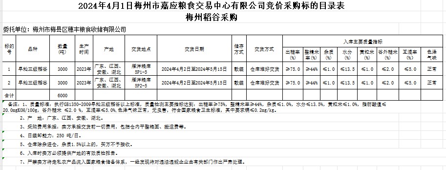 受客戶委托,梅州市嘉應(yīng)糧食交易中心有限公司定于2024年4月1日(星期一)舉辦糧食競價交易會。梅州市梅縣區(qū)穗豐糧食收儲有限公司擬采購2023年產(chǎn)早秈稻6000噸。