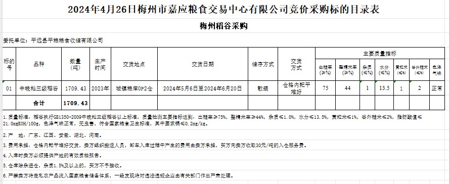 受客戶委托,梅州市嘉應糧食交易中心有限公司定于2024年4月26日(星期五)舉辦糧食競價交易會。平遠縣平糧糧食收儲有限公司擬采購2023年產(chǎn)中晚秈稻谷1709.43噸。