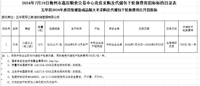 五華縣2024年度縣級儲備成品糧大米采購及代儲包干輪換費(fèi)用公開招標(biāo)公告