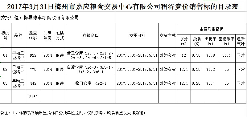 受客戶委托,梅州市嘉應(yīng)糧食交易中心有限公司定于2017年3月31日舉辦糧食競價(jià)交易會(huì),梅州市梅縣區(qū)穗豐糧食收儲(chǔ)有限公司擬銷售早秈三級(jí)稻谷2139噸。