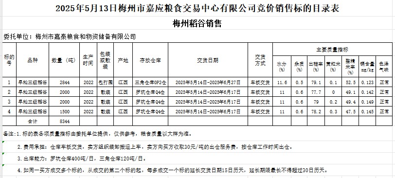 受客戶委托,梅州市嘉應糧食交易中心有限公司定于2025年5月13日(星期二)舉辦糧食競價交易會。梅州市嘉泰糧食和物資儲備有限公司擬銷售2022年產(chǎn)早秈稻谷8344噸。