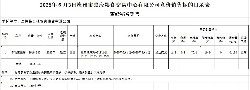 2025年6月3日蕉嶺縣金穗糧食收儲(chǔ)有限公司稻谷銷售