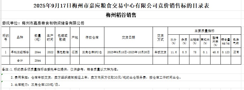 受客戶委托,梅州市嘉應糧食交易中心有限公司定于2025年9月17日(星期三)舉辦糧食競價交易會。梅州市嘉泰糧食和物資儲備有限公司擬銷售2022年產(chǎn)早秈稻谷2844噸。