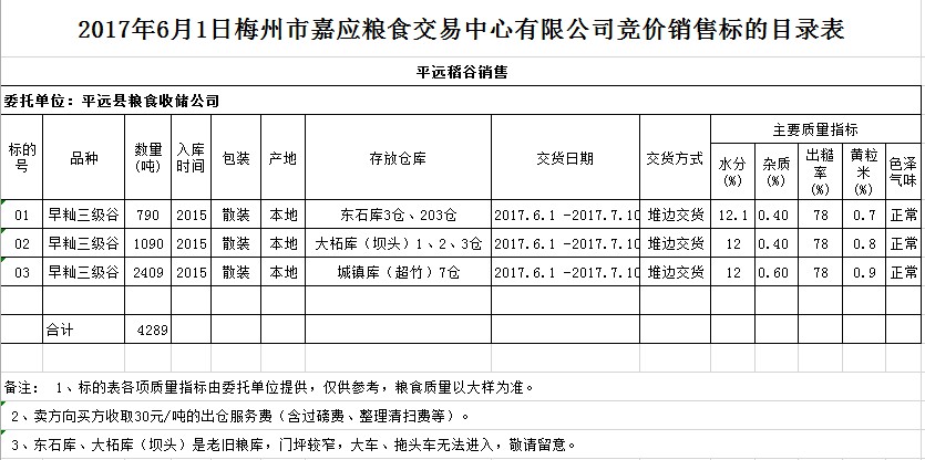 受客戶委托,梅州市嘉應(yīng)糧食交易中心有限公司定于2017年6月1日舉辦糧食競(jìng)價(jià)交易會(huì),平遠(yuǎn)縣糧食收儲(chǔ)公司擬銷售2015年早秈三級(jí)稻谷4289噸。