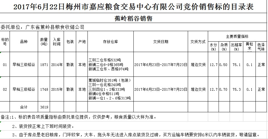 受客戶委托,梅州市嘉應(yīng)糧食交易中心有限公司定于2017年6月22日舉辦糧食競價交易會,廣東省蕉嶺縣糧食收儲公司擬銷售2014、2015年早秈三級稻谷共3619噸。