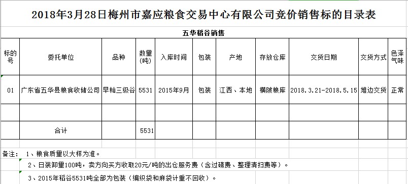 2018年3月28日廣東省五華縣糧食收儲(chǔ)公司稻谷銷售