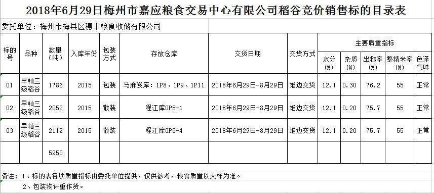 交易時間和地點:2018年6月29日(星期五)上午10時15分。廣東省梅州市彬芳大道南161號梅州市糧食交易中心3樓。